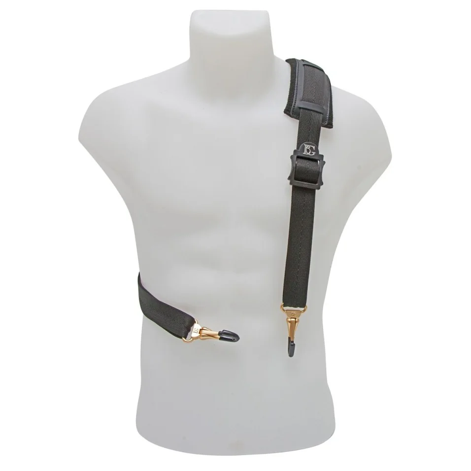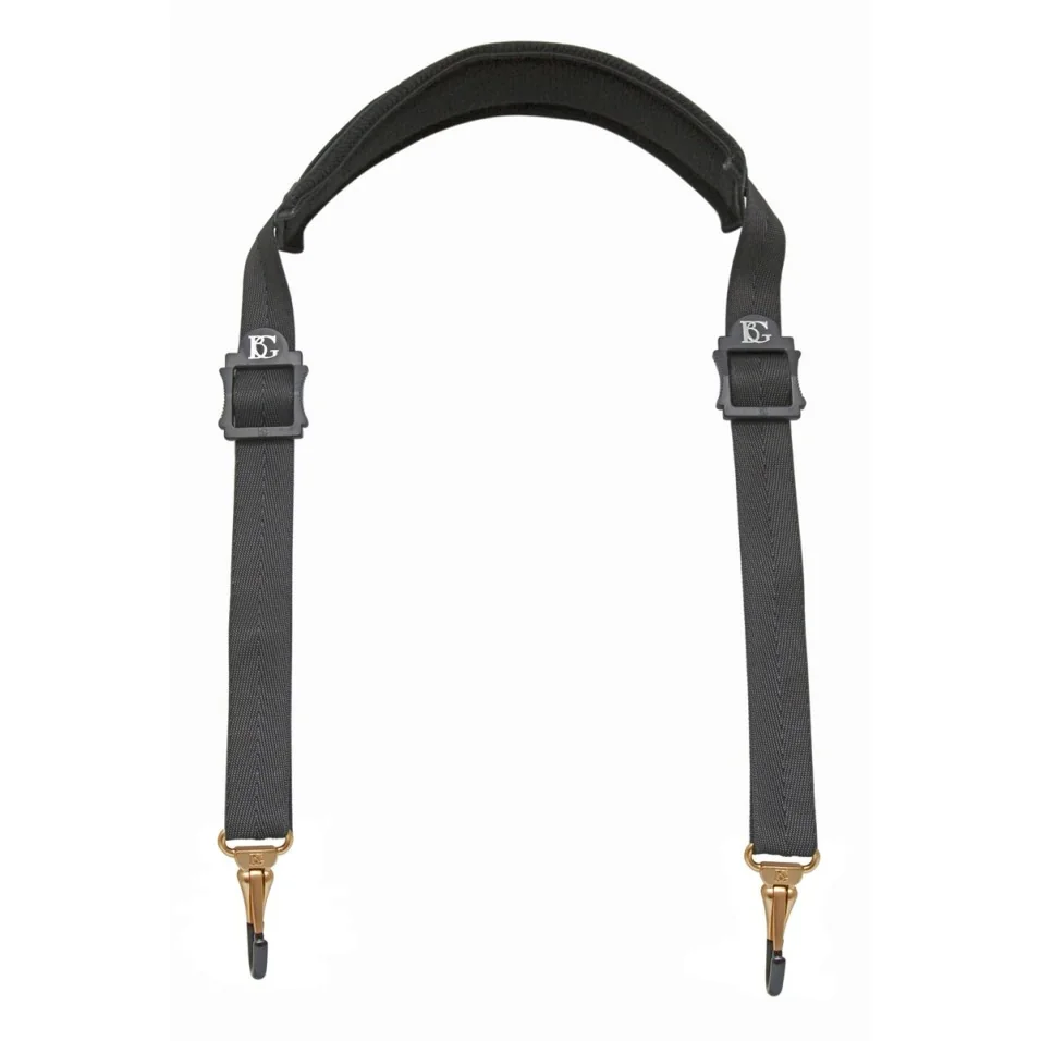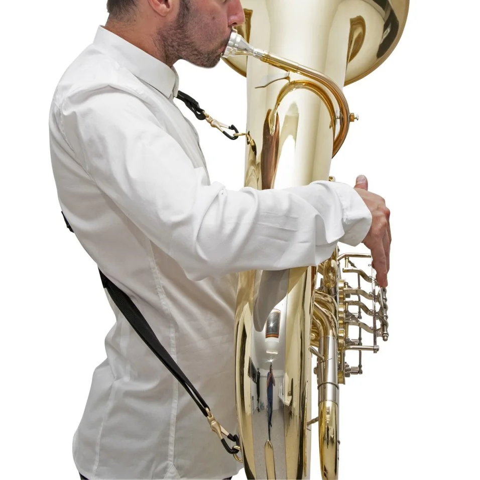 La bandolera BG en nylon para Tuba y Eufonio está compuesta de una hombrera de cuero forrada con esponja de algodón, hebillas con correa ajustable, y dos mosquetones metálicos plastificados para fijar el instrumento.